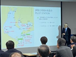 今月は名古屋海運貨物取扱業会の紹介により、日本水先人会連合会 会長の髙尾幸徳氏をお招きし、「日本の輸出入の99.6%が船で運ばれている!日本経済の最前線で頑張る、海のPILOT 水先人!」と題して、船を安全かつ効率的に入出港させるため、船長のアドバイザーとして乗船する水先人(パイロット)の現場での役割や普段なかなか見ることができない仕事風景など映像を交えながらご講演いただきました。
