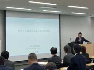今月は名古屋海運協会の紹介により、HFC株式会社 代表取締役の堀彰宏氏をお招きし、「空気から資源を生み出すMOF技術」と題して、ガス・蒸気を貯蔵/分離できるMOF(多孔性金属錯体)という物質の特性を解説いただき、MOFを活用した事業化実績や社会実装に向けた過程や課題についてご講演いただきました。